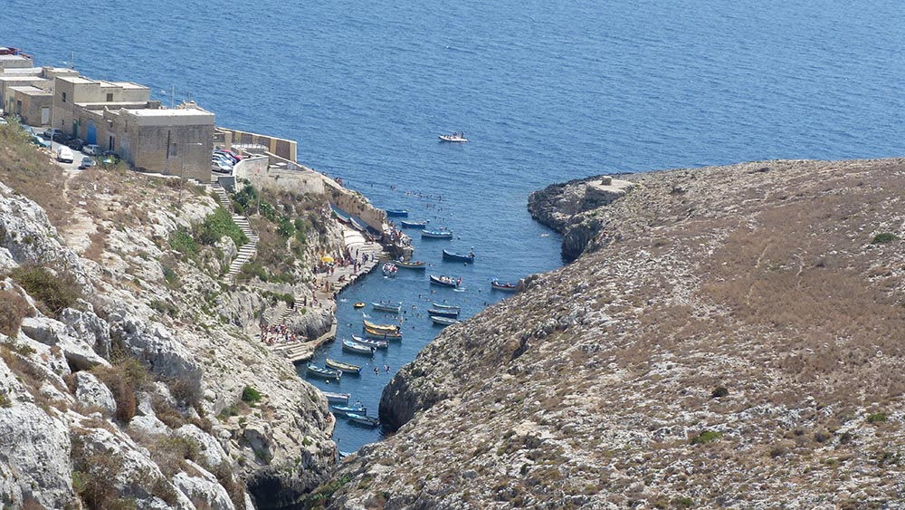Les pêcheurs du petit village de Wied iz-Zurried organisent des excursions par bateau pour visiter cette curieuse grotte . Malheureusement, nous sommes arrivés un peu tard : le site était assailli par les touristes, et cela nous a un peu découragés. Tous les guides de voyage préconisent en effet de se rendre sur les lieux le matin, pour bénéficier de la quiétude des eaux sur lesquelles se reflète le soleil. (Avec nos soucis de bus, notre programme a été quelque peu compromis!)
