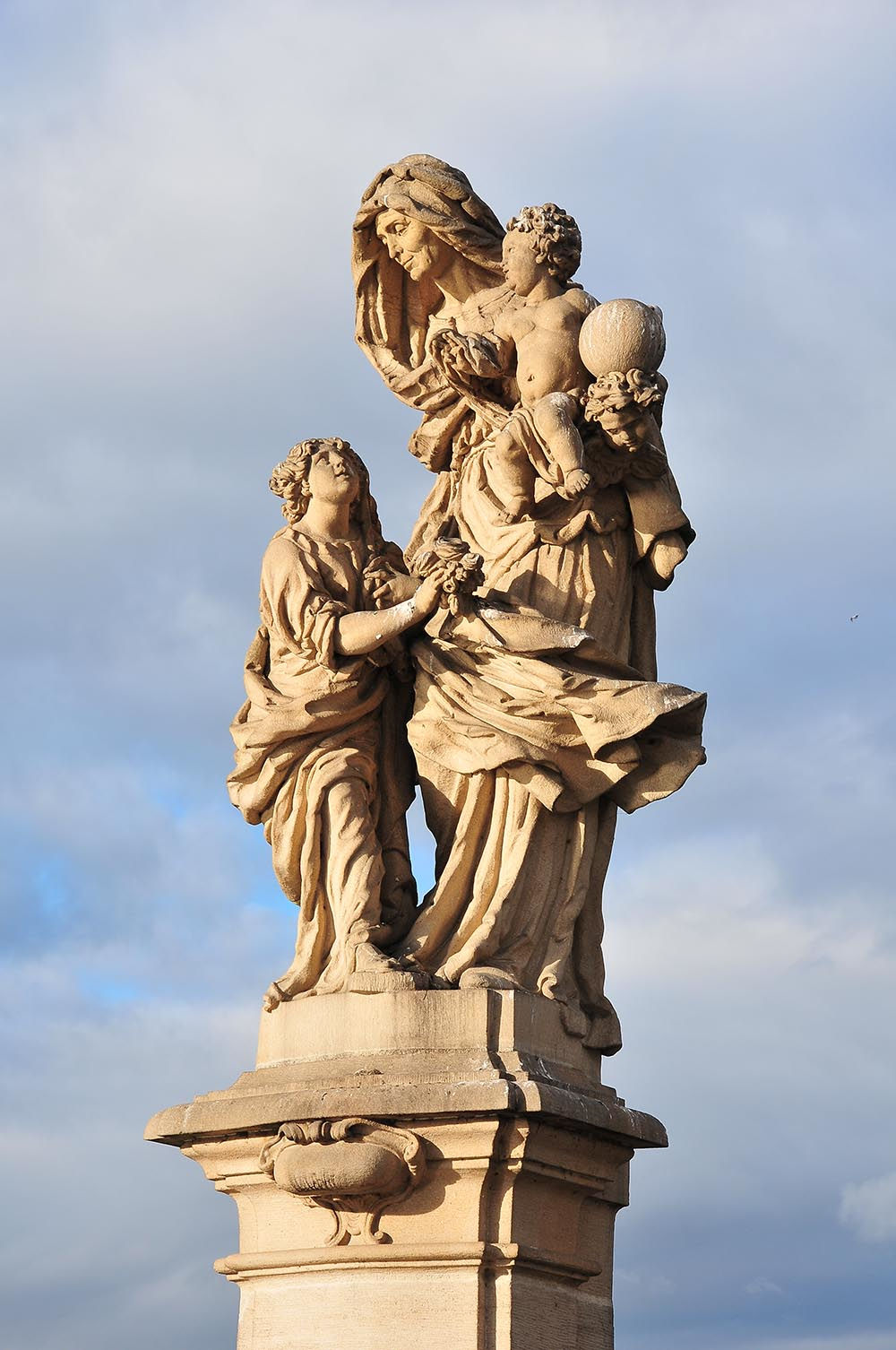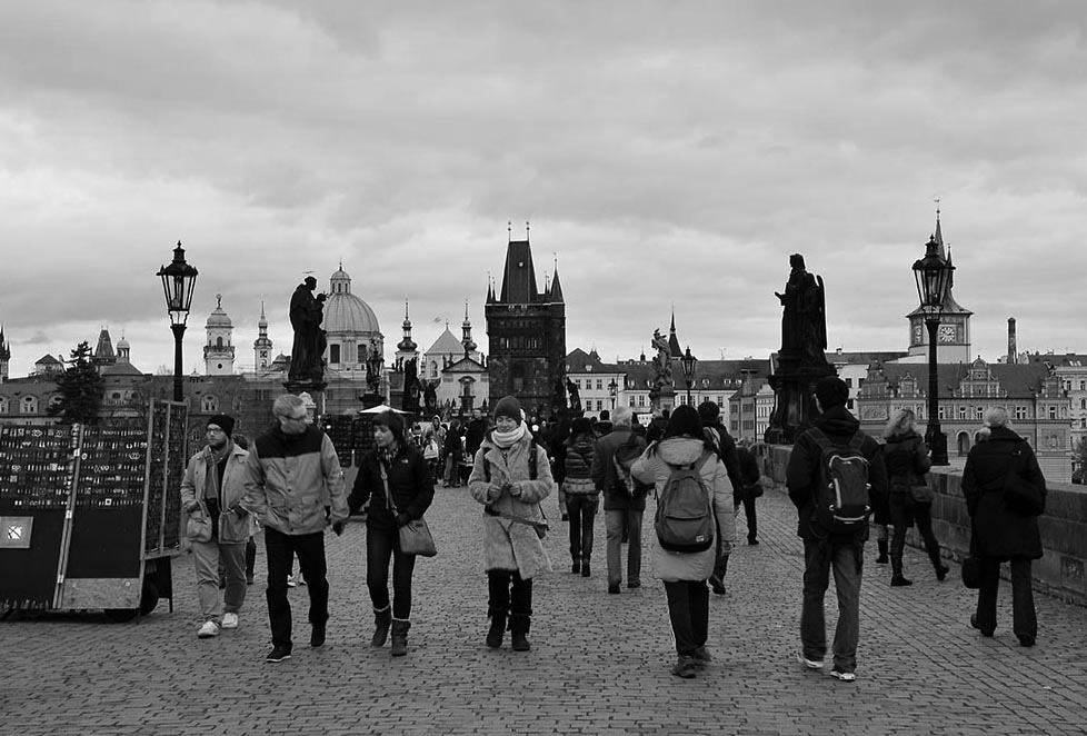 Nous avons ensuite traversé le célèbre pont Charles, assailli par le fourmillement des touristes. Je crains qu’il n’y ait guère qu’à l’aube et en début de journée que l’on puisse profiter flâner librement et prendre le temps d’admirer les 75 statues qui se succèdent sur toute la longueur du pont. Les visiteurs de toute contrée fraîchement débarqués dans la ville se précipitent ensuite ici par paquets, se pressent le long des emplacements indiqués dans leurs guides et s’immiscent involontairement sur vos photos… (NB: Certains d’entre eux ont probablement pensé la même chose de moi, puisque nous sommes arrivés en fin d’après-midi sur le pont, et nous sommes mêlés à eux 🙂 !)