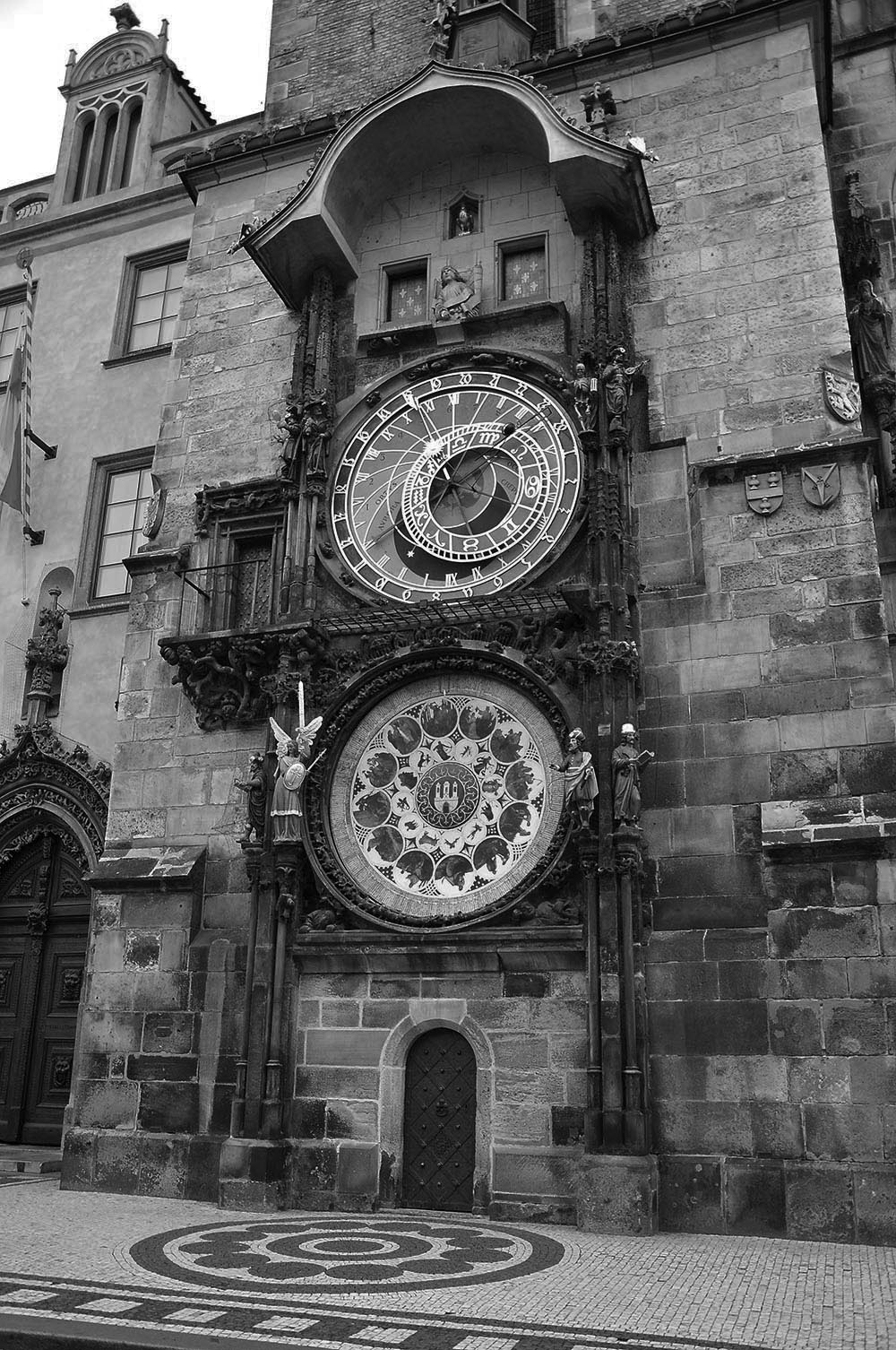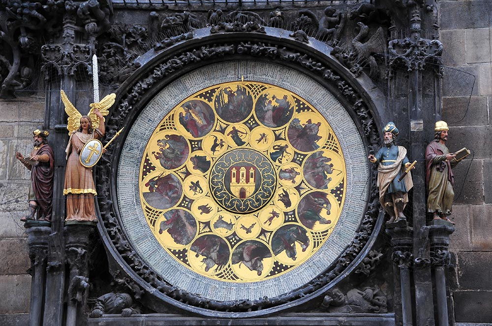 Plusieurs cadrans composent cette horloge, qui permet de lire l’heure de multiples façons! L’heure tchèque, par exemple, est indiquée par les chiffres romains. Il est aussi possible de lire l’heure en douzièmes de jours (désignée par la position du Soleil sur les courbes dorées), la position de la Lune ou du Soleil dans le ciel … (etc.) Pour tout vous avouer, je n’ai pas compris grand-chose^^