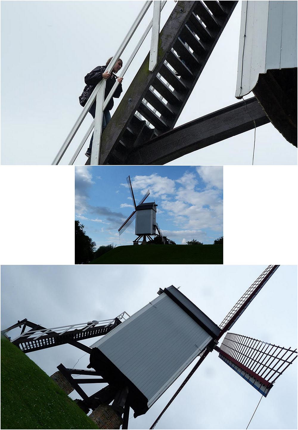 L’après-midi, nous avons appréhendé l’atmosphère la ville en flânant dans ses rues et ruelles, goûté aux frites belges, déambulé dans les chocolateries , et grimpé tout en haut des moulins situés à l’Est de la ville. Nous avons tenu à immortaliser ma montée en haut de ces immenses et impressionnantes machines (dont certaines sont encore en service). Je souffre de vertige, et la descente a été plus difficile^^ !