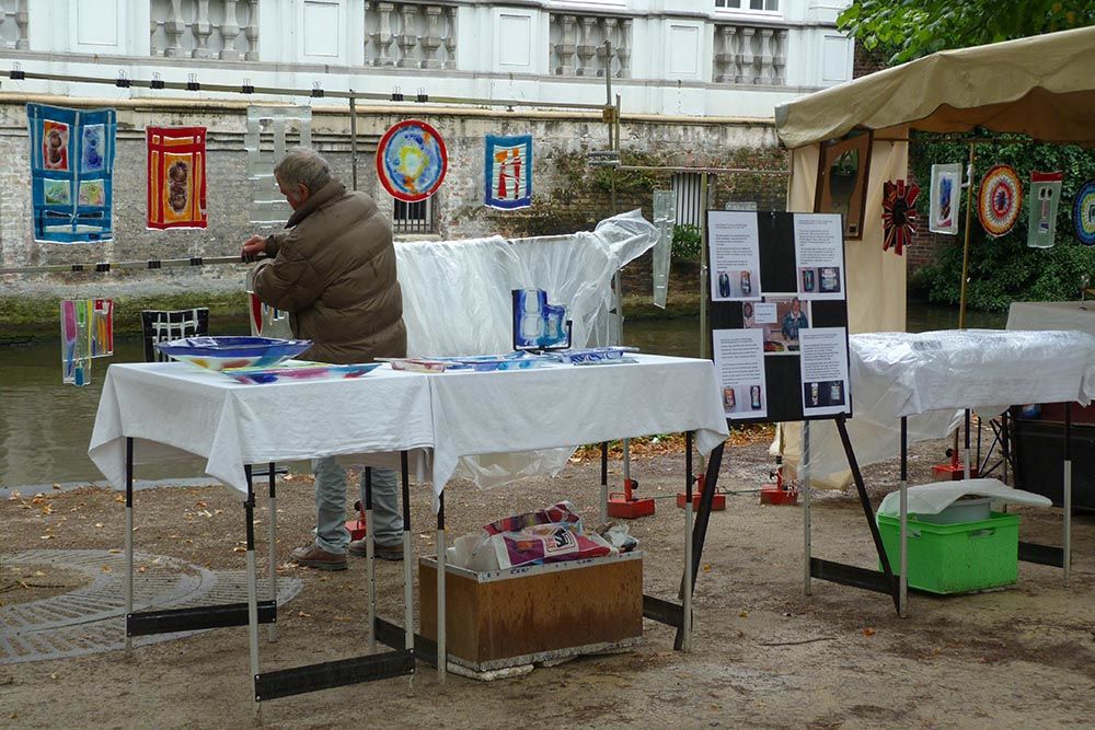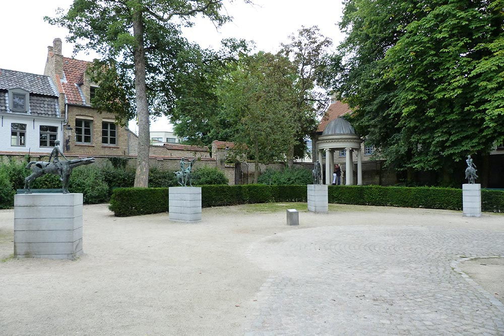 Les jardins de la maison Arents abritent notamment ce petit kiosque, ou les statues de Rik Poot sur les 4 cavaliers de l’Apocalypse, qui représentent de façon allégorique les horreurs terrestres (la mort, la guerre, la faim et la révolution). N’oubliez pas de traverser le pont Boniface, le plus petit pont de Bruges! 🙂