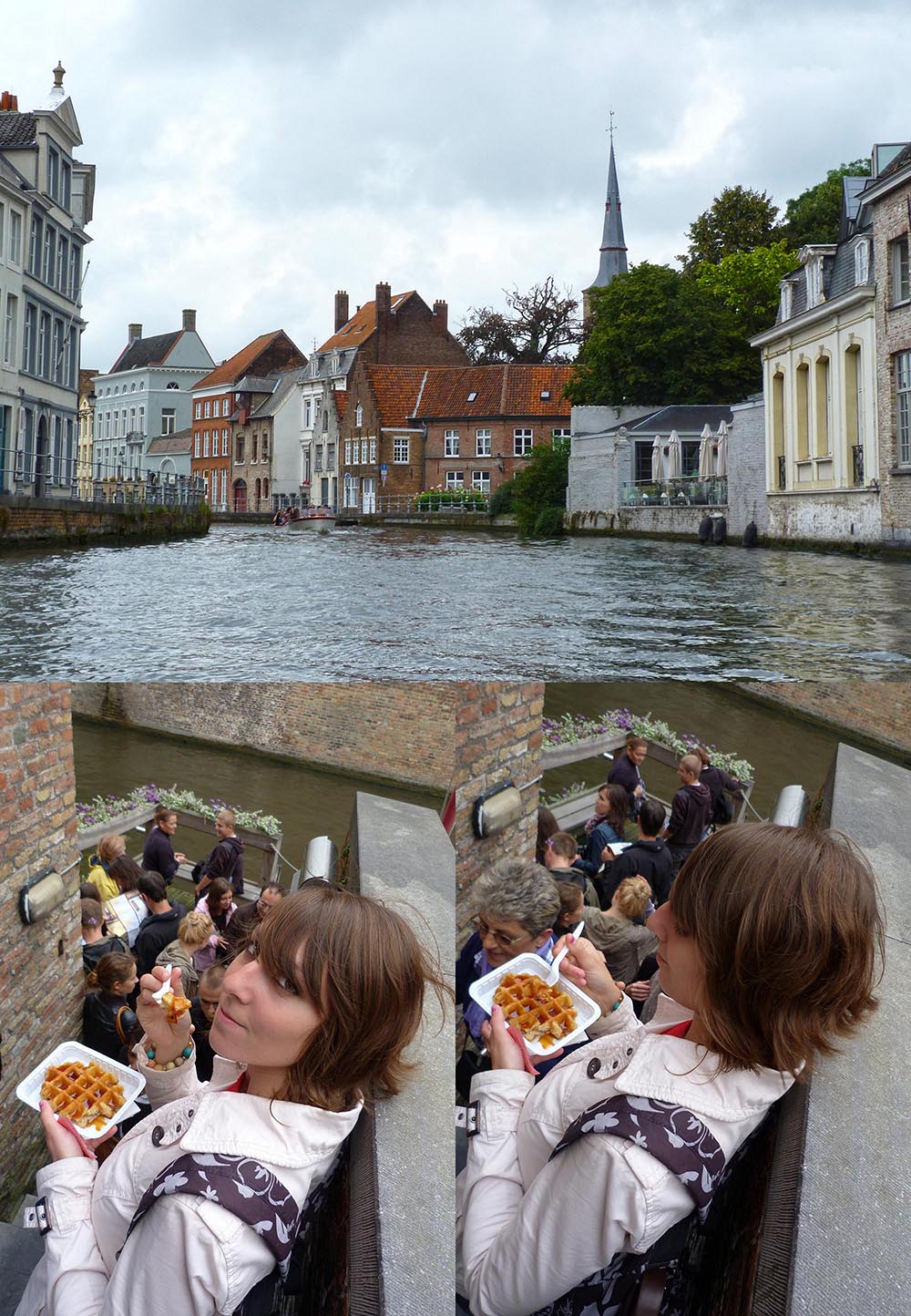 * Les canaux brugeois. La promenade en barque sur ces canaux (environ 7euros) nous a laissé un sentiment mitigé. Ce type de « croisière » , certes, est toujours très plaisant et distrayant, et offre un point de vue différent sur la ville… mais nous avions déjà arpenté les rues du quartier la veille, et n’avons finalement pas découvert grand-chose. Je conseillerais plutôt cette visite aux touristes fraîchement débarqués à Bruges…