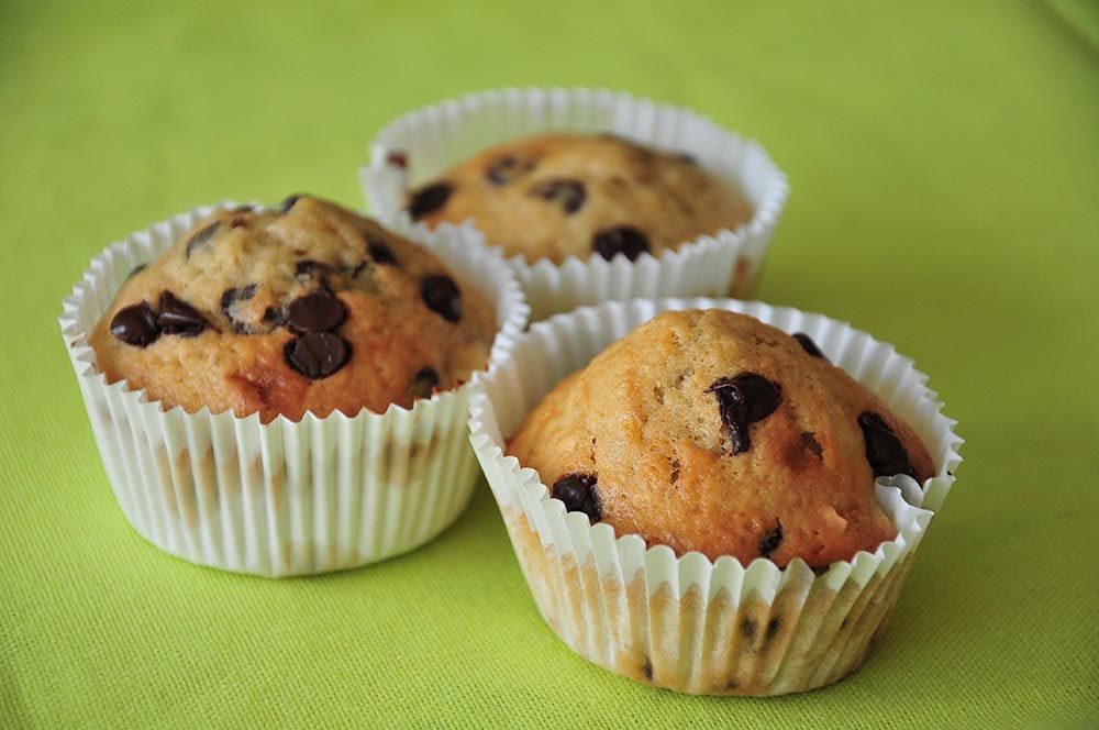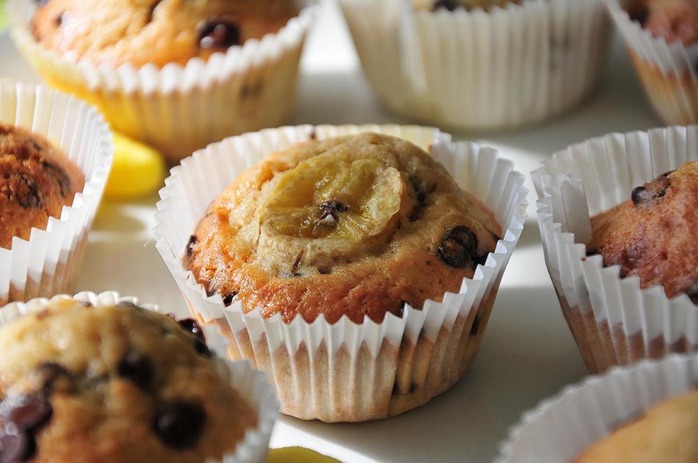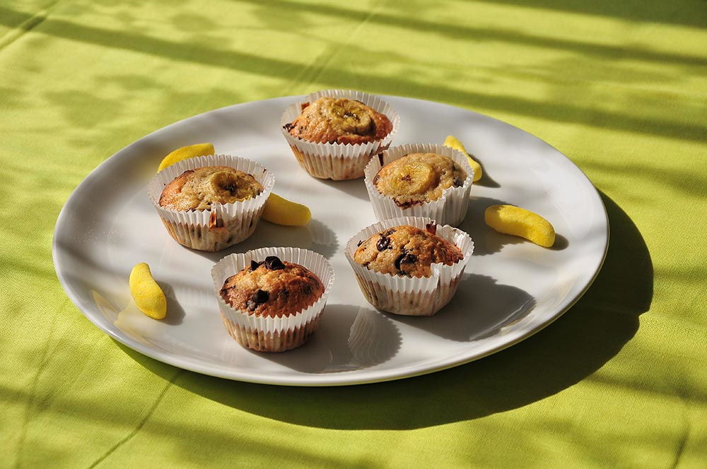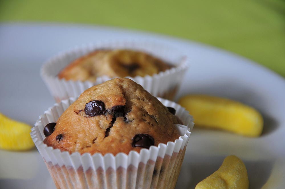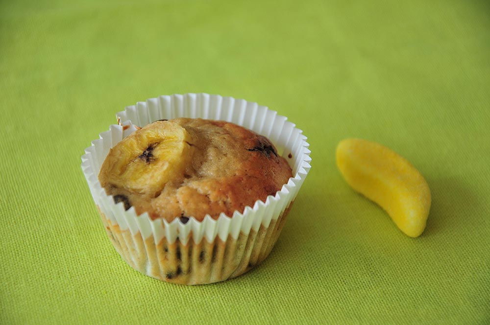 Aujourd’hui, je partage avec vous une petite recette de muffins à la banane et aux pépites de chocolat ! Encore malade, je n’avais pas envie de rester très longtemps aux fourneaux… Pour ce, j’ai mixé les ingrédients de deux recettes trouvées dans les livres qui ornent mon étagère!