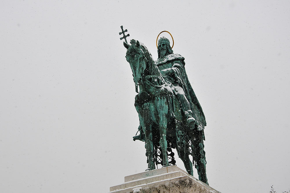 Etienne 1er, le premier roi de Hongrie, est ici représenté chevauchant son cheval, vêtu de son manteau de couronnement, et brandissant la double croix apostolique , symbole de la conversion du pays au christianisme.