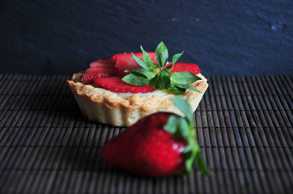 NB: pour un effet brillant, vous pouvez étaler, à l’aide d’un pinceau, du sirop de sucre ou un peu de confiture sur vos fraises 🙂 !