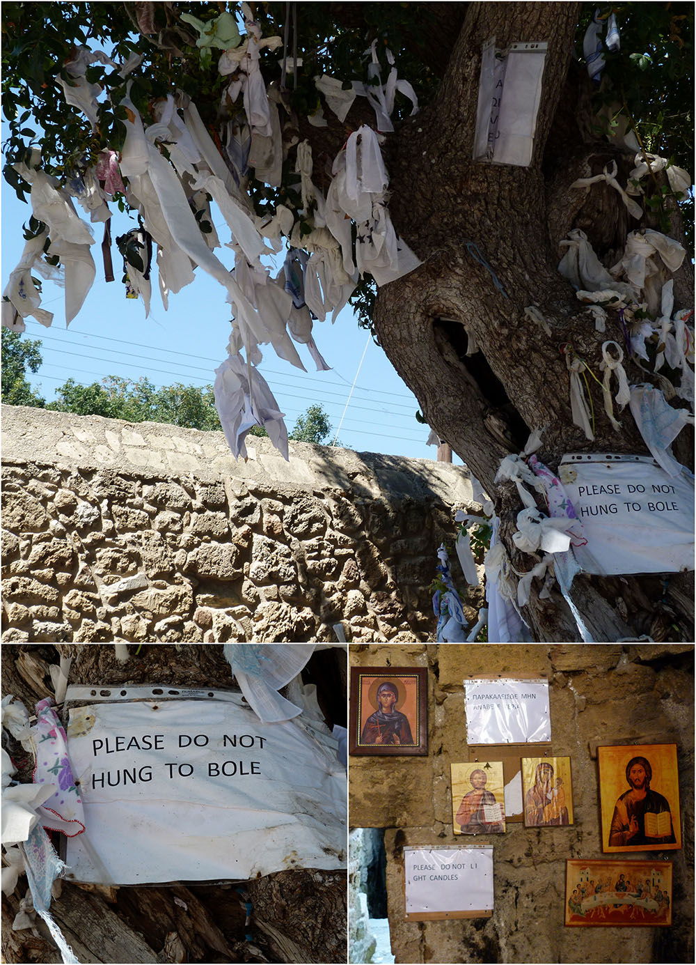 Je n’avais jamais visité de catacombes, et ignorais complètement à quoi cela ressemblait. Poussés par ma curiosité, nous avons remonté l’avenue Apostolou Pavlou et observé celles dédiées aux 7 frères Maccabées, des martyrs ayant refusé de se convertir au culte de Zeus Olympien au VIIIe siècle . L’entrée de cette grotte « des sept dormeurs » est signalée par des ex-voto de chiffons accrochés à un arbre. Une petite chapelle ornée d’icônes et d’images pieuses débouche sur les différentes chambres mortuaires, tout aussi ornementées.