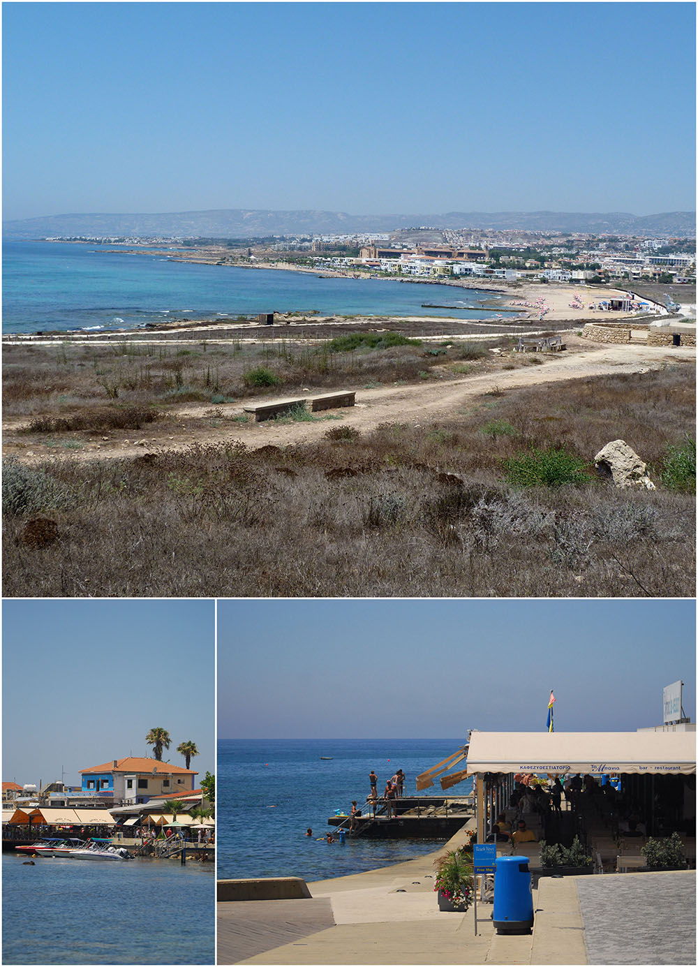 Après Larnaca, Paphos est très certainement la ville du sud de l’île la plus intéressante en termes de tourisme. Située au sud-ouest de l’île, cette agglomération de plus de 70 000 habitants a développé ses infrastructures hôtelières et accueille aujourd’hui de plus en plus de touristes. Je serais incapable de vous dire si ceux-ci sont attirés par le riche patrimoine de la ville (plusieurs de ses sites sont d’ailleurs classés au Patrimoine de l’UNESCO) ou par ses plages les plus réputées (comme celle de Kato Paphos). Nous nous sommes quant à nous baignés un petit moment sur un banc de sable situé en plein centre-ville, pour nous rafraîchir et oublier quelques instants la température étouffante qui régnait ce jour-là, mais nous n’avons pas poussé jusqu’aux plages plus modernes et développées.