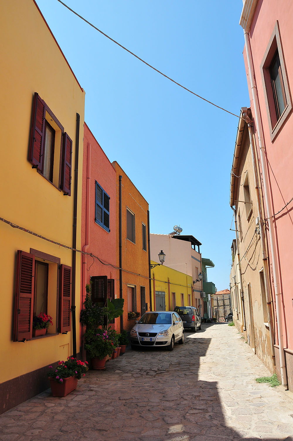 La ville ne comporte pas de « grosses » curiosités ou de réel point d’intérêt, hormis peut-être sa tour de 30m en trachtye rouge ou la petite église qui apparaît dans les photographies ci-dessous. Elle est d’ailleurs plus connue pour ses fonctions portuaires ou sa station d’embarquement pour l’Isola Piana… Cependant, ses baies rocheuses, ses belles plages, ses maisons aux couleurs pastels et leurs balcons fleuris valaient les kilomètres parcourus… Nous sommes restés quelques heures à Portoscuso, nous plaisant à nous balader dans ses petites ruelles, et à déguster des glaces aux goûts trèèès variés (nous y avons même trouvé un parfum mojito) le long de son port de pêche.