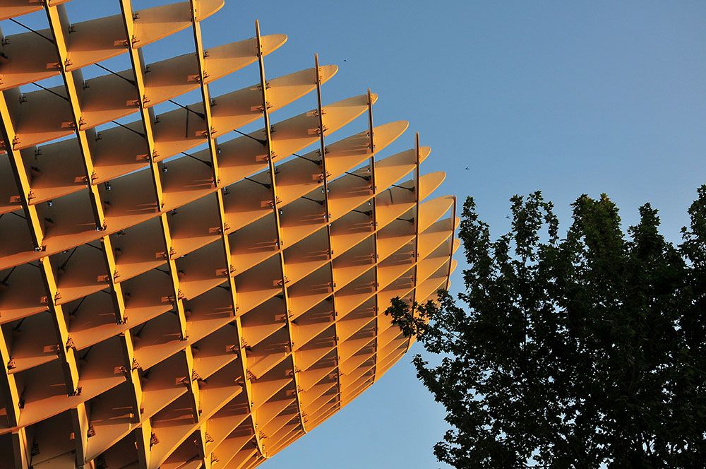…imaginée par Jurgen Mayer H. et implantée au beau milieu d’une place commerçante traditionnelle : le désormais célèbre El Metropol Parasol, plaza de la Encarnación. Cette superstructure en bois, objet de controverses, est une véritable prouesse architecturale, unique au monde… Bonne ou mauvaise chose, je n’en sais rien, chacun se forgera son propre avis. En ce qui me concerne, je trouve l’oeuvre audacieuse et ce toit constitué de milliers d’alvéoles (tel une ruche flottant dans les aires) assez élégant. Les sévillans l’ont aussi rebaptisée las Setas (les Champignons), en référence aux piliers aux airs de champignons qui soutiennent l’ensemble.