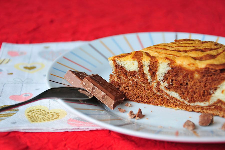 Je ne sais pas trop pourquoi les zébrures de mon zebra cake partent dans tous les sens. Ceci est probablement du à l’ajout de chocolat fondu (ou à ma maladresse légendaire).^^ Pas facile pour moi de verser les différentes couches sans mettre des coulures partout.^^ Pour les « déplacements de cuillère », je me suis aidée d’un bol, destiné à récupérer les éventuels débordements…