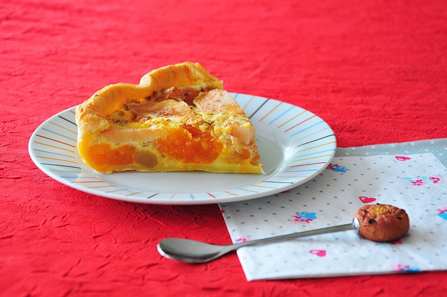 Saupoudrez votre fond de tarte de pralin. Disposez les quartiers de poire et les abricots dessus/