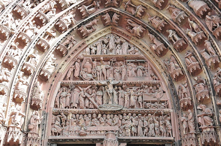 Bonsoir, La cathédrale alsacienne est une mer veille gohtique, mais que représentent les multiples sculptures de son portail d’entrée (la dentelle de grès rose) ?