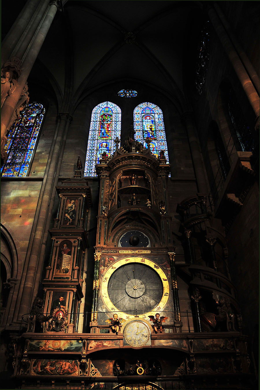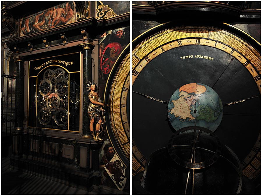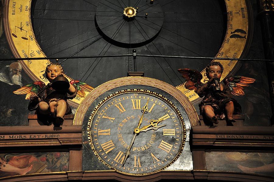 La cathédrale Notre-Dame de Strasbourg peut aussi s’enorgueillir d’accueillir en son sein cet ouvrage classé monument historique depuis 1987. Sur ses trois cadrans, on peut à la fois lire l’heure, le jour (les sept jours de la semaine sont signalés par des divinités, installées sur des chars), le mois, l’année, le signe du zodiaque, la phase lunaire et la position des planètes jusqu’à Saturne…