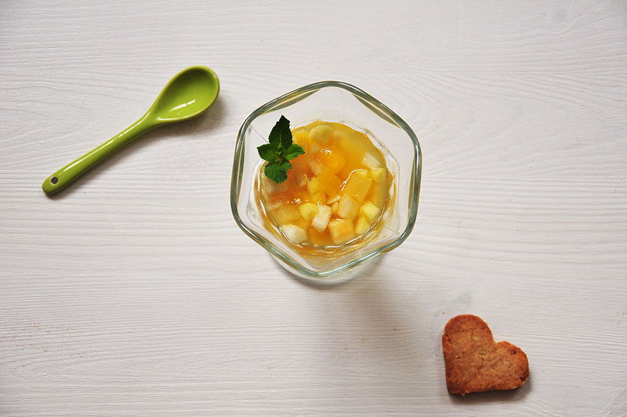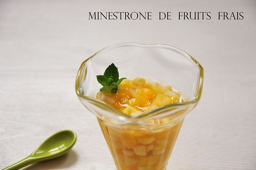 Versez le sirop refroidi sur ce minestrone de fruits. A l’aide d’une cuillère à soupe, distribuez le tout dans vos coupelles.