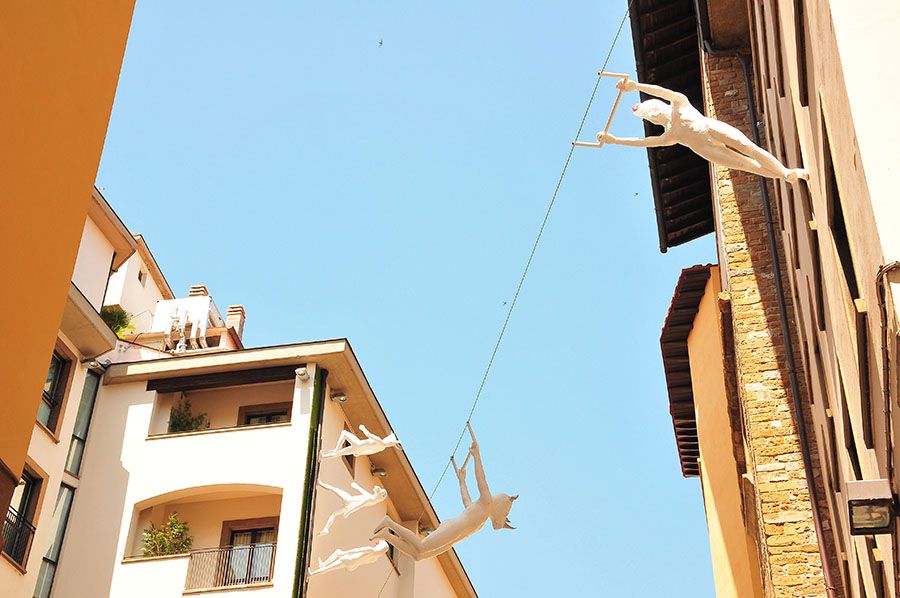 Pour être tout à fait honnête, le design n’est pas ma grande passion… J’ai fini par trouver l’inspiration lors de mon week-end à Florence, la semaine dernière… On pourrait même dire que celle-ci est tombée du ciel! L‘étrange installation de Simone Auria capte l’oeil des passants, et surprend. Ce mélange d’architecture classique et de détails modernes, en bas de la Vicolo dell’Oro, et à deux pas du célèbre Ponte Vecchio, joue avec le concept du portrait, et présente la figure humaine avec des attributs d’animaux. Un joli clin d’oeil à la pratique des Médicis, qui ont maintes fois intégré des animaux dans leurs portraits.