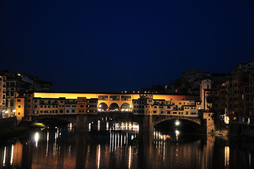 Au demeurant, c’est à la nuit tombée que le charme des lieux prend effet. Les rives se parent de leurs plus belles couleurs, et mille lumières miroitent dans les eaux sombres de l’Arno…