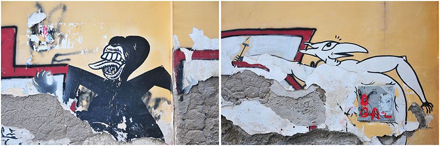 A Naples, on vous propose du haschisch et des vêtements de contrefaçon sur les étals du marché (normal). A Naples, on croise effectivement, comme j’avais pu le lire sur la toile, des messieurs en costume noir qu’on assimile automatiquement à des mafiiiooosos (ah, ces préjugés^^). A Naples, on fait les gros yeux devant le nombre d’immondices qui jonchent le sol. A Naples, on déplore le nombre de monuments taggués. A Naples , les ruelles sont tellement étroites qu’il est difficile de les photographier et que seuls les scooters peuvent y passer. A Naples, on a peur de se faire écraser. A Naples, les façades effritées des maisons menacent parfois de s’effondrer sous notre passage. A Naples, on peut mourir, donc 😀 A Naples, on se dit que l’on va bien faire attention à son téléphone ou son porte-monnaie.