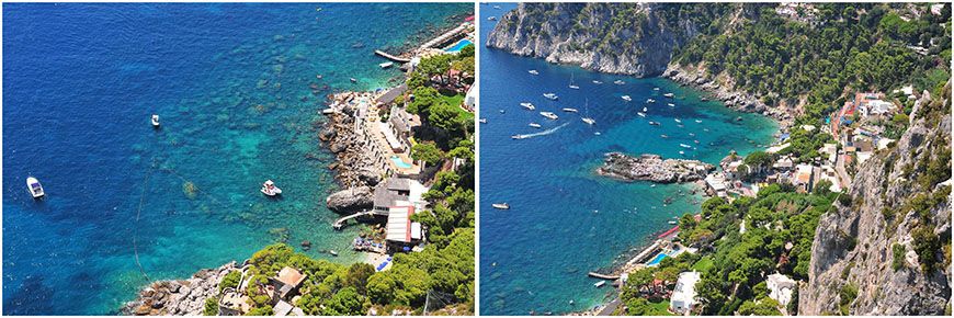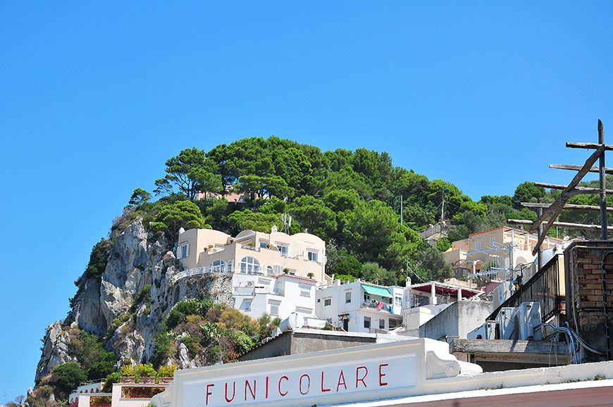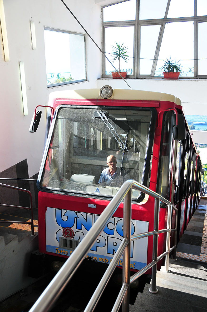 Une fois repus, nous ne nous sommes pas attardés au port, très typique des villes/lieux très touristiques, et où s’agglutinaient moult groupes de personnes autour des bateaux de plaisance permettant de faire le tour de l’île… De toute façon, Capri se découvre depuis ses hauteurs, accessibles en funiculaire…