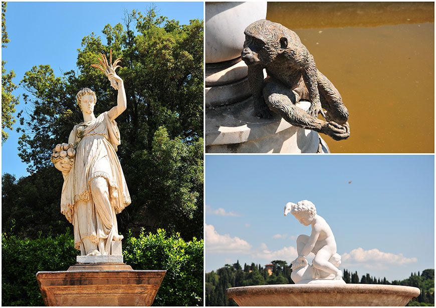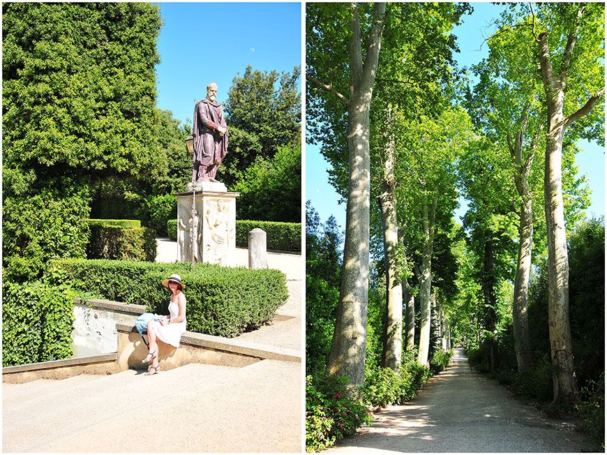 De nombreuses statues sont dispersées ça et là et il est agréable de s’y promener et de découvrir tout à tour le bassin de Neptune, la grotte artificielle de Buontalenti (un genre de décor très à la mode au XVIe siècle), la fontaine de Bacchus, le piazzale dell’Isolotto et son jardin aquatique… Un véritable musée à ciel ouvert ! Plusieurs heures sont nécessaires si vous souhaiter arpenter les allées, profiter de la fraîcheur des fontaines et découvrir les musées qui s’y trouvent … et dont l’entrée est comprise dans le billet : la galerie des Costumes, le musée de l’Argenterie, et le musée de la porcelaine (mais qui étaient fermés le jour de notre passage !). Bref, vous l’aurez compris, cette promenade me semble incontournable! ^^