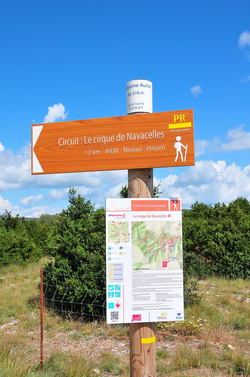 Plusieurs parcours de randonnée sont proposés dans le site de Navacelles et ses alentours, identifiables grâce à des couleurs, qui vous aideront à vous repérer (plus) facilement. Nous nous sommes tout de même perdus, mais peu importe. ^^ (J’ai une légère tendance à tenir les plans à l’envers…) Après nous êtres garés sur un vaste parking, nous avons choisi de suivre le parcours jaune …