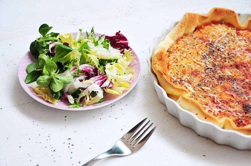 Pour la garniture: 250g de thon, une petit boîte de concentré de tomate, un oeuf, 20cL de crème liquide, 100g d’emmental râpé, du sel, du poivre, et des herbes de provence