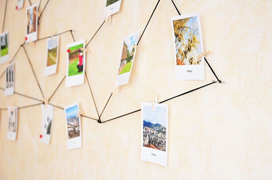 Il vous suffit ensuite de planter quelques clous ça et là et de réaliser la figure de votre choix en enroulant les fils entre les différents clous, et d’y accrocher vos polaroïds.