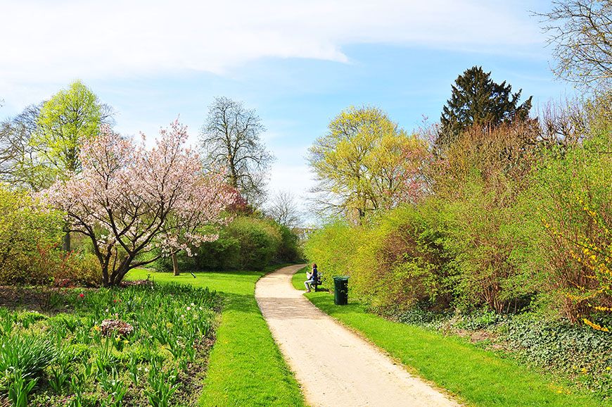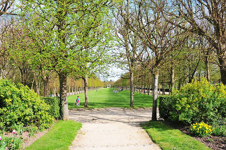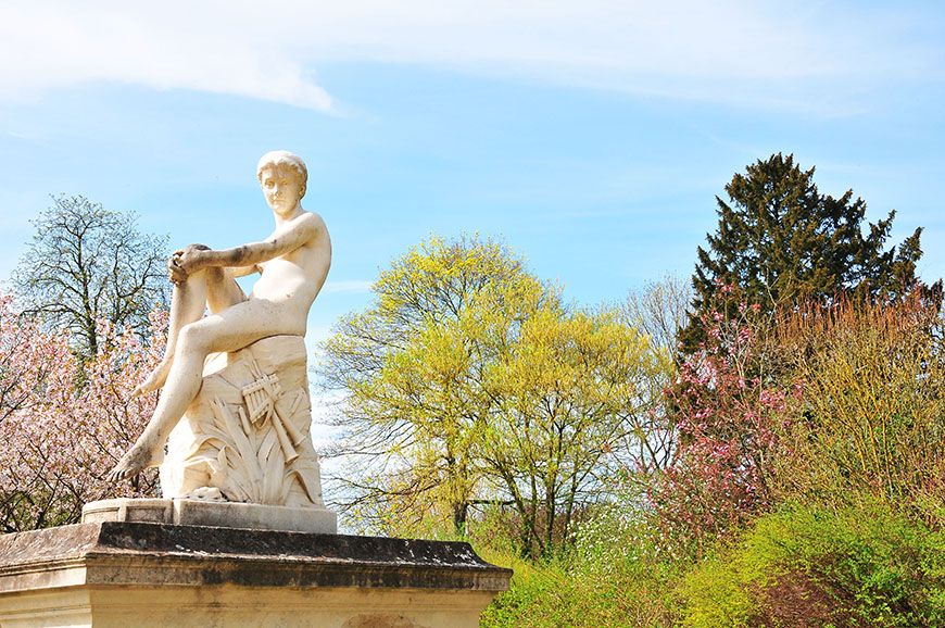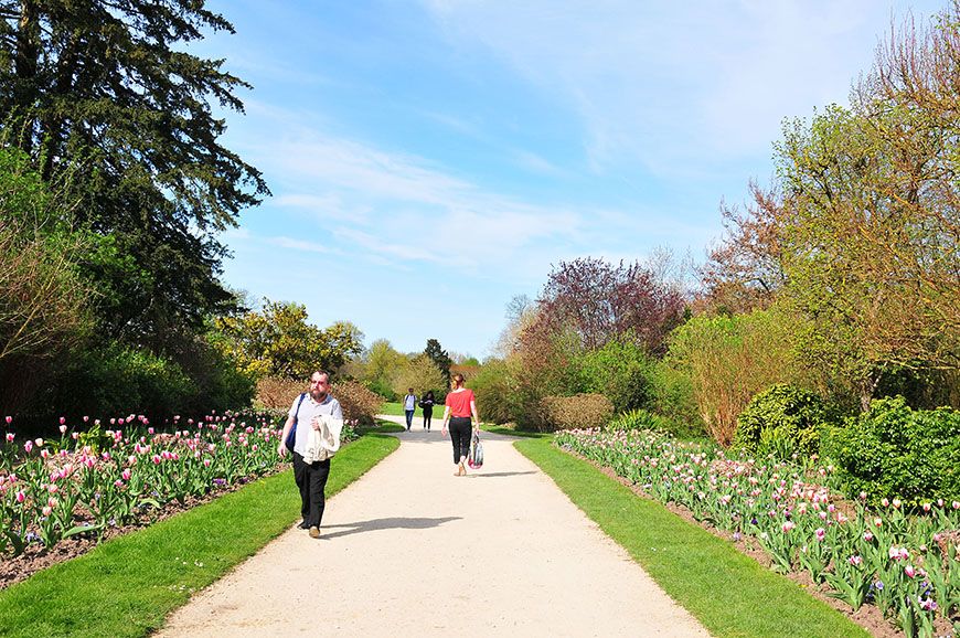 Le parc du Palais est subdivisé en plusieurs petits espaces: le jardin des Roses (ouvert les quatre dernières semaines du printemps de 14h30 à 18H00) , le petit Parc et le Grand Parc, plus connu sous le nom de « trouée des Beaux Monts », qui s’étend sur près de 5km, et relie le jardin à la forêt. La balade y est certes moins impressionnante qu’à Versailles, mais non moins dénuée d’intérêt, et très agréable au printemps!