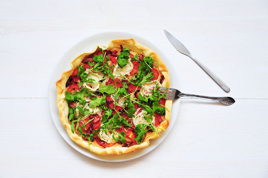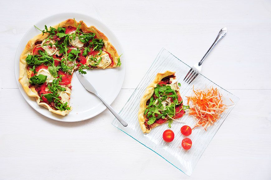 Sortez la tarte du four, parsemez de roquette, et dégustez 🙂
