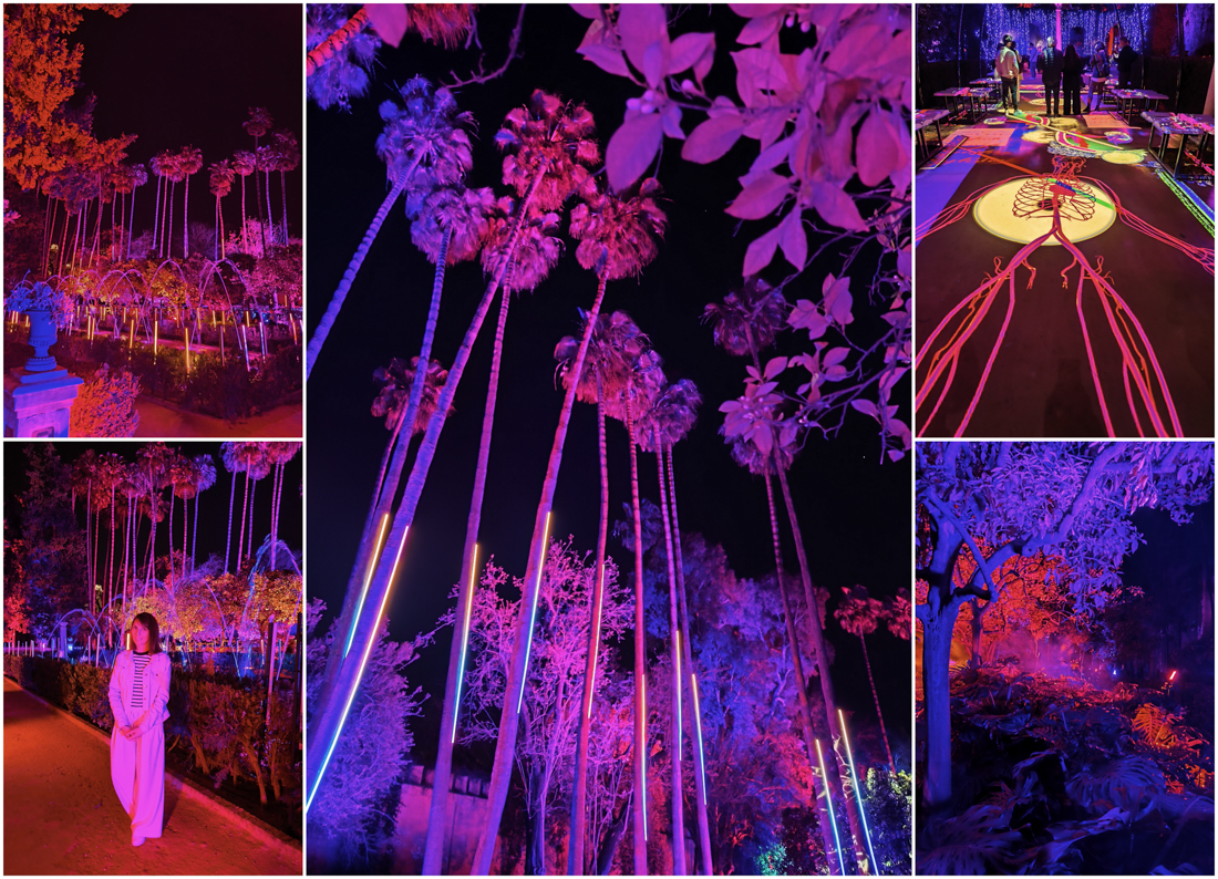 Peut-être avait-il simplement décidé de me surprendre. Et de m’émouvoir autrement. La promenade se déroule de nuit, dans des jardins métamorphosés par la lumière. Les arbres se parent de couleurs mouvantes, les façades s’animent, la musique enveloppe l’espace avec douceur. On avance lentement, presque en apesanteur. Une magnifique promenade nocturne durant laquelle nature et architecture s’illuminent en une harmonie onirique. Un moment suspendu dans la beauté du lieu et de l’instant.