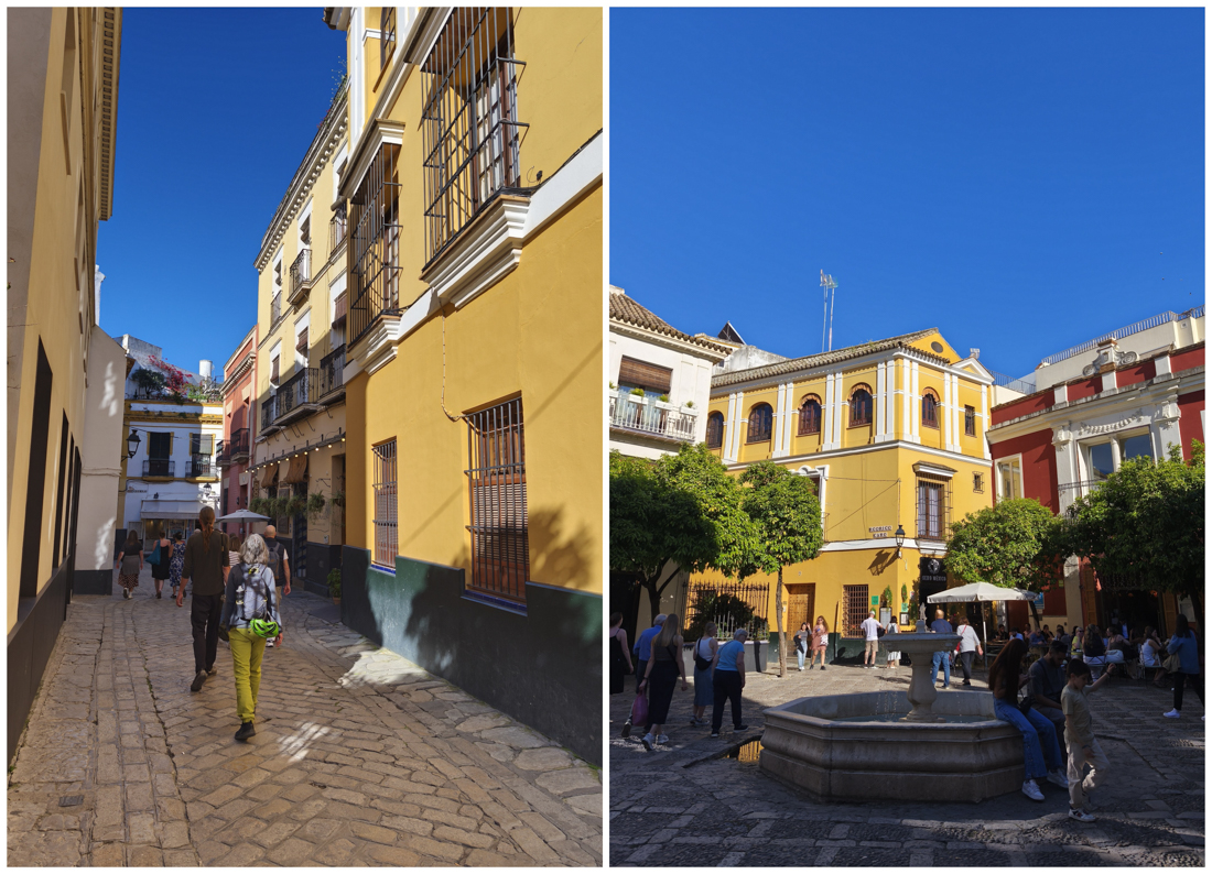 À deux pas de la cathédrale, l’ancienne judería de Séville est un véritable labyrinthe de ruelles sinueuses et de places romantiques. Les petites maisons y sont tantôt blanchies à la chaux, tantôt parées de couleurs vives, avec des balcons en fer forgé, des pots de fleurs qui débordent, et cette lumière si particulière qui change selon l’heure et l’ombre des murs.