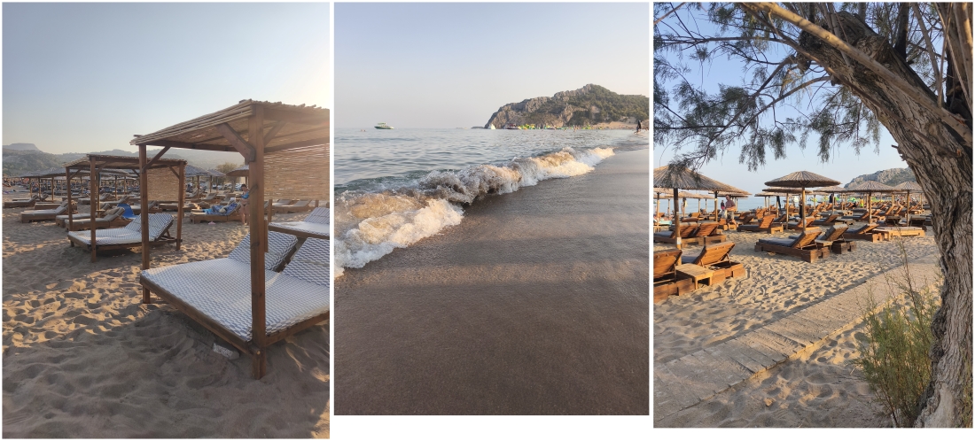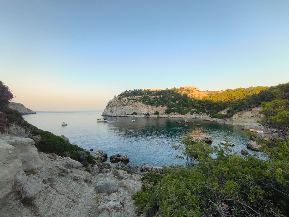 - Anthony Quinn Bay : une petite crique encaissée, aux eaux très claires, parfaite pour le snorkeling . Mon coup de cœur sur l’île . Nous y sommes arrivés le soir de notre première journée, alors que la lumière commençait doucement à décliner. À ce moment-là, la mer prenait des reflets profonds, et les derniers rayons du soleil accrochaient les reliefs de Rhodes au loin, dessinant leurs silhouettes sur l’horizon. Tout semblait plus lent, plus suspendu, comme si l’île nous souhaitait la bienvenue à sa manière.